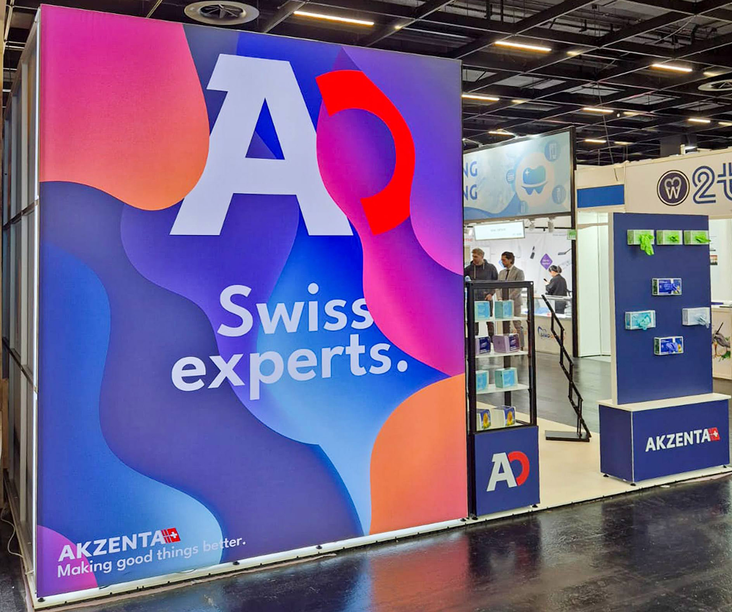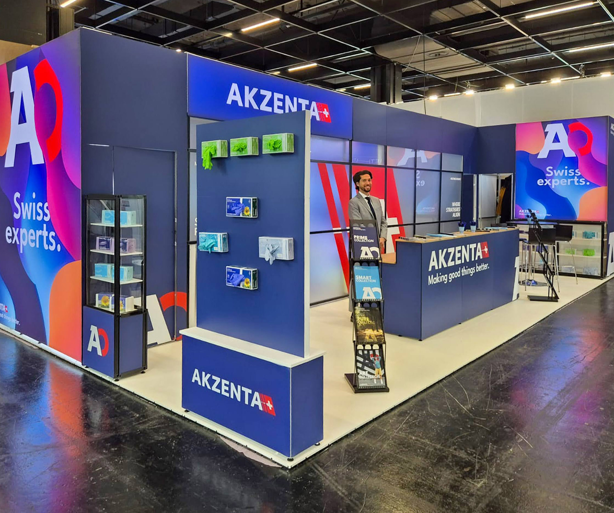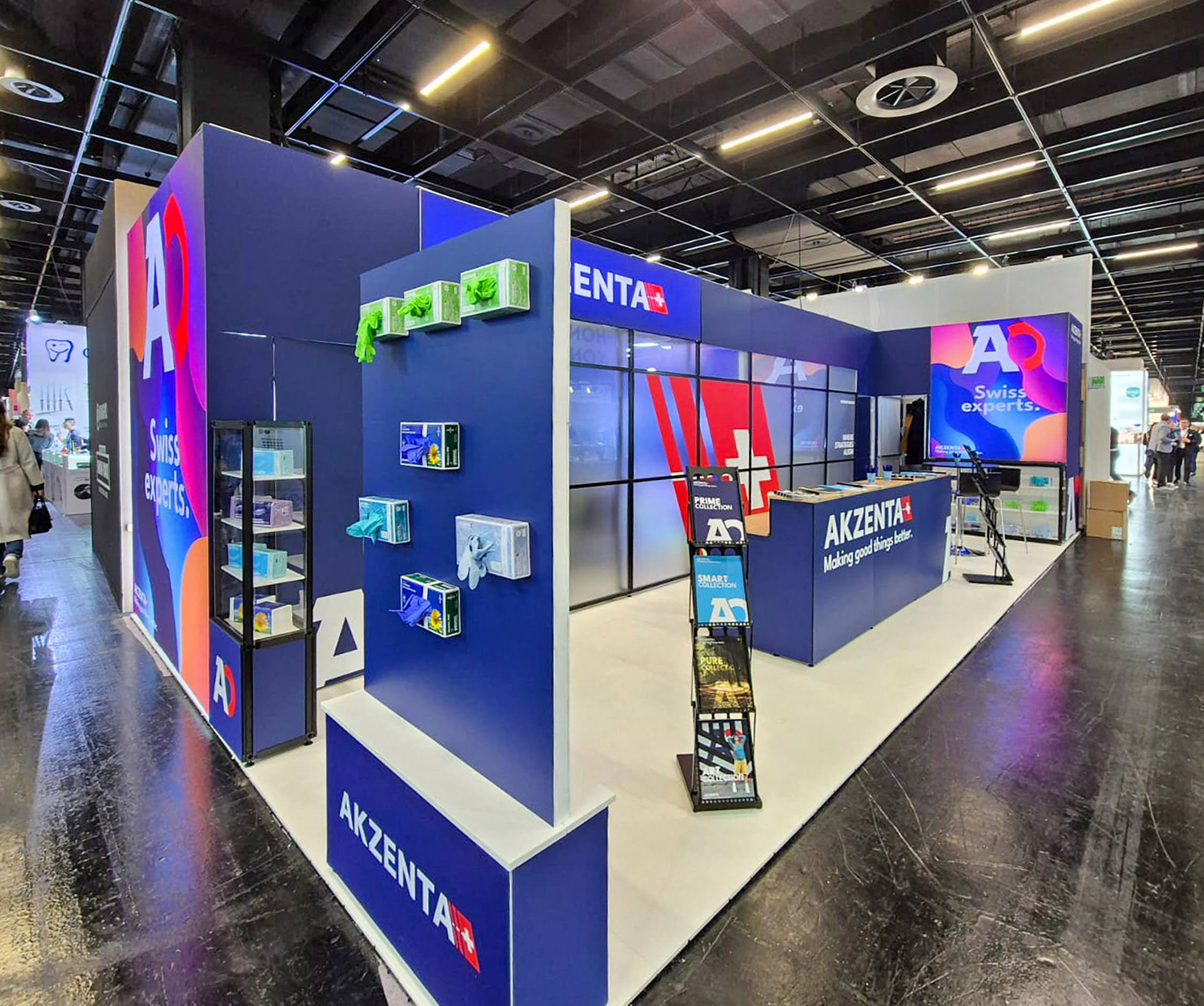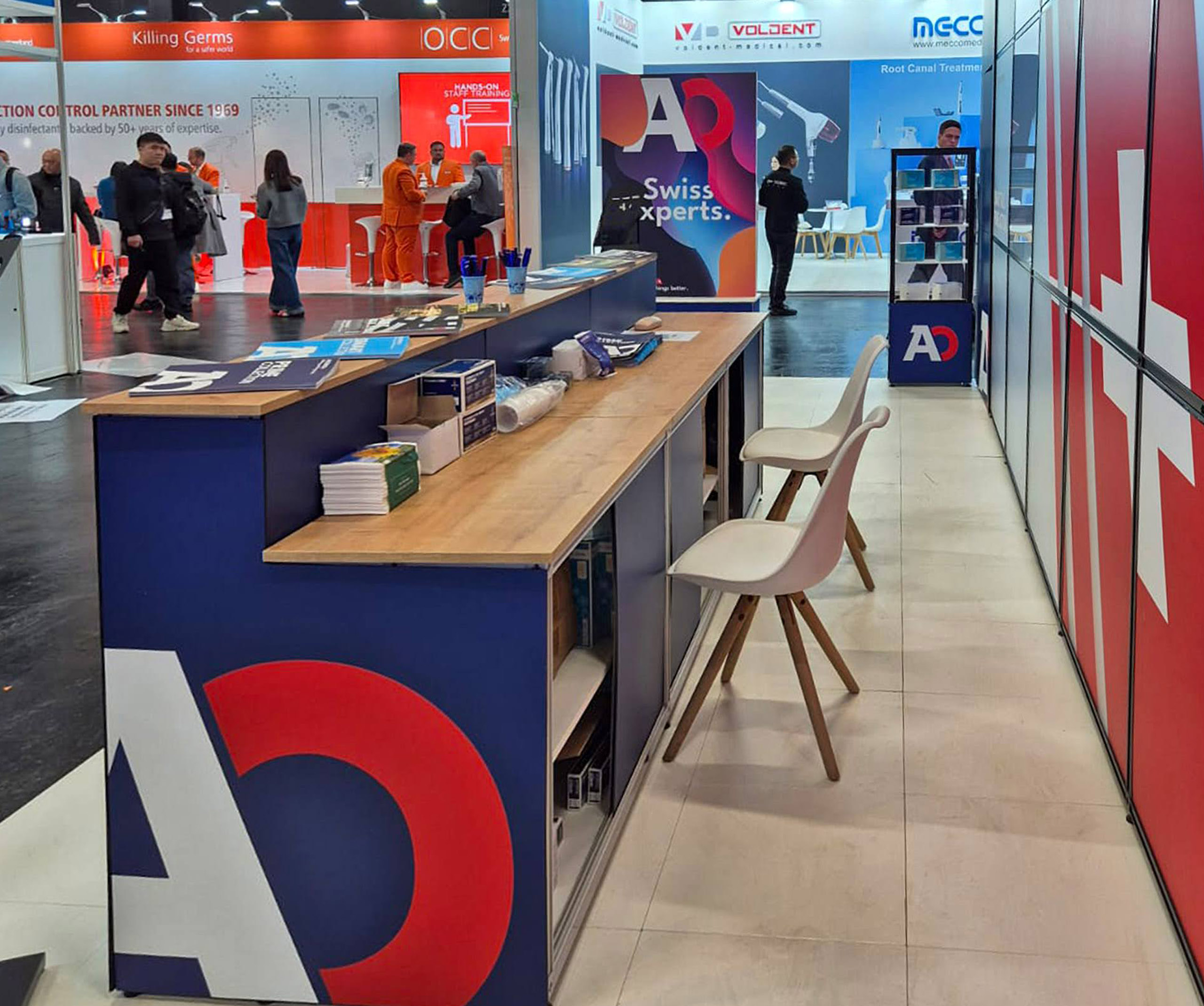 Ein geschäftlich anders konzipierter Messestand für einen Kunden, der Verbrauchsmaterialien für Zahnarztpraxen liefert. Der Hauptteil des Standes besteht aus zwei Besprechungsräumen, die für private Treffen mit Kunden vorgesehen sind. Das ausgestellte Produkt tritt in diesem Fall in den Hintergrund zugunsten vertraulicher Gespräche und dem Abschluss von Vereinbarungen.