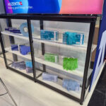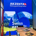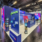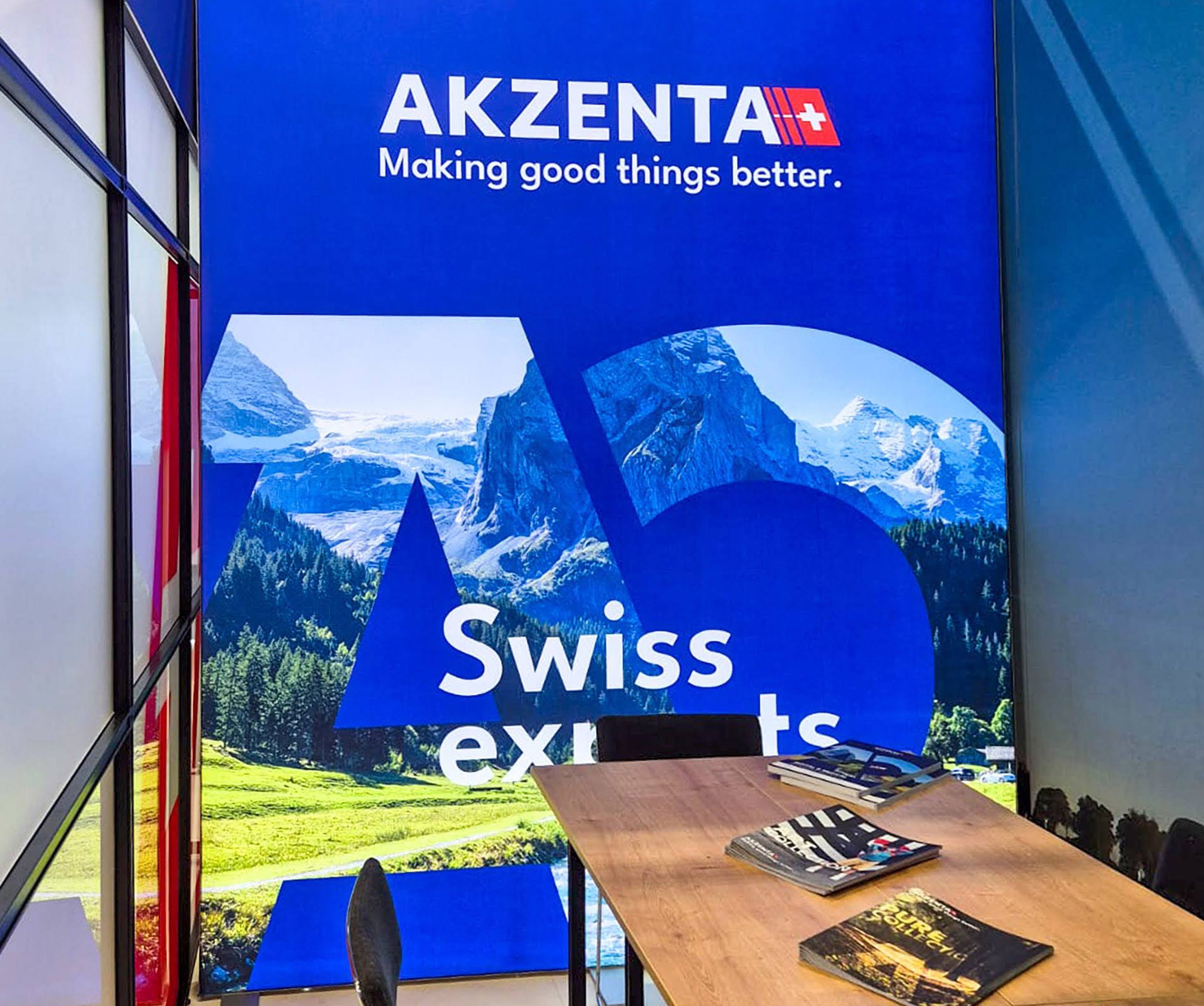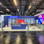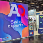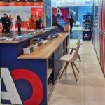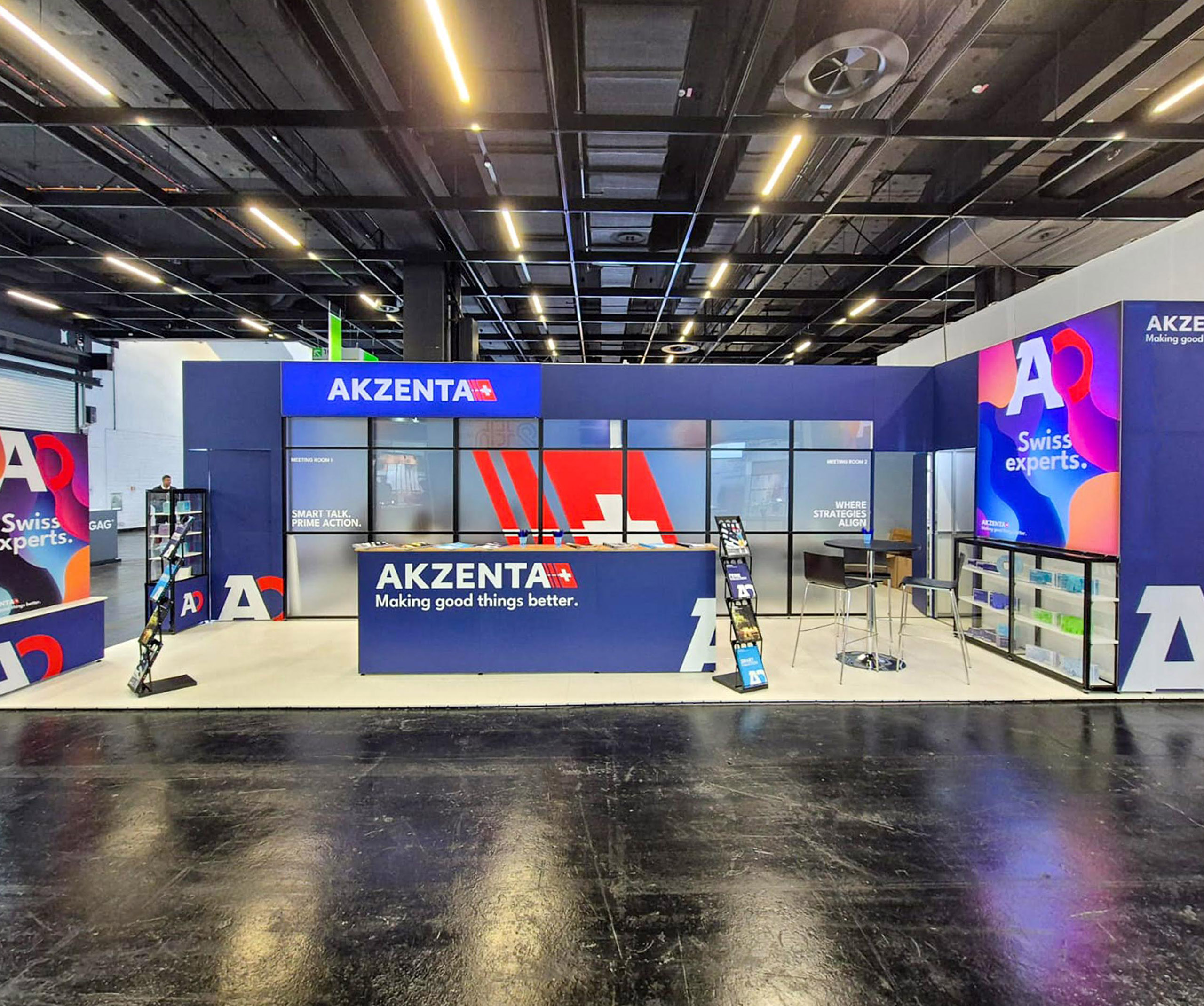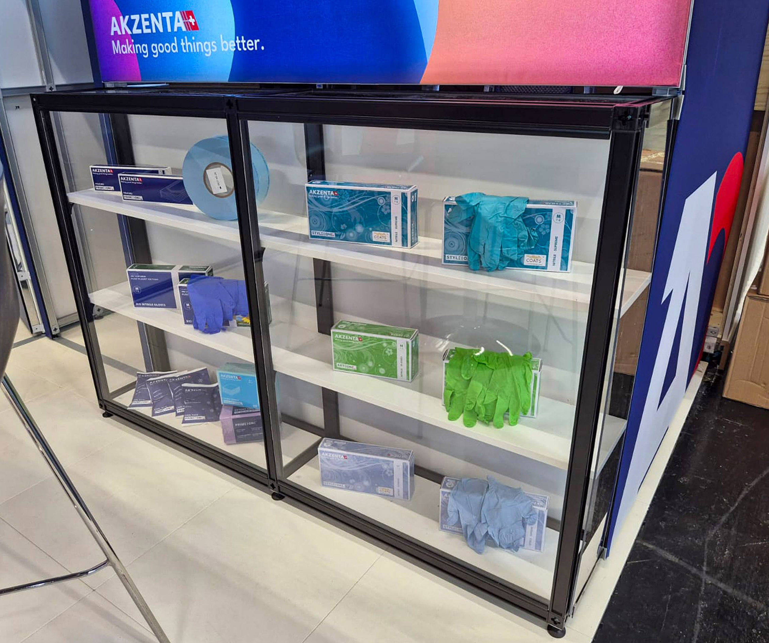 Ein geschäftlich anders konzipierter Messestand für einen Kunden, der Verbrauchsmaterialien für Zahnarztpraxen liefert. Der Hauptteil des Standes besteht aus zwei Besprechungsräumen, die für private Treffen mit Kunden vorgesehen sind. Das ausgestellte Produkt tritt in diesem Fall in den Hintergrund zugunsten vertraulicher Gespräche und dem Abschluss von Vereinbarungen.